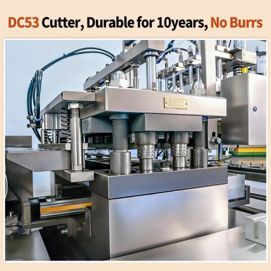 Màng vỉ có các khoang được tạo hình sẵn sau đó được đưa vào trạm dập lỗ, nơi một khuôn dập chính xác sẽ cắt màng thành các vỉ riêng lẻ. Quá trình dập lỗ được đồng bộ hóa với lực kéo của động cơ servo, đảm bảo các cạnh sạch sẽ, không có gờ trên mỗi vỉ.