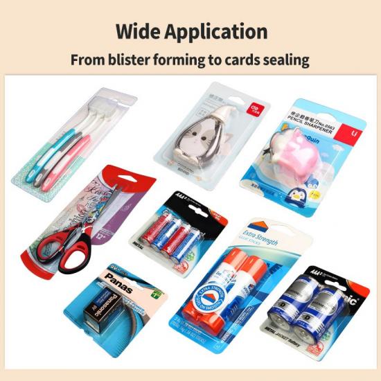 Đây là giải pháp đáng tin cậy để đóng gói các linh kiện điện tử nhỏ (ví dụ: đầu nối, điện trở, điốt) và các loại pin khác nhau (pin cúc áo, pin lithium-ion, pin trụ). Là một máy dán vỉ pin chuyên dụng, nó tạo ra lớp niêm phong chống ẩm, chống tĩnh điện, bảo vệ các linh kiện điện tử nhạy cảm và pin khỏi hư hại do môi trường, đảm bảo hiệu suất sản phẩm trong quá trình lưu trữ và vận chuyển. Vỉ pin cứng cáp cũng ngăn ngừa biến dạng sản phẩm hoặc đoản mạch do va chạm.